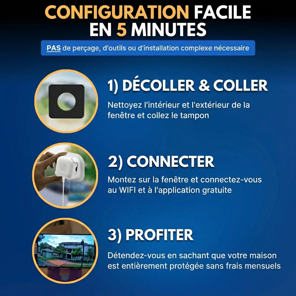 Pas de perceuse, d'échelle ni d'outils. Collez-la simplement sur n'importe quelle fenêtre, branchez et connectez. Terminé en moins de 5 minutes.