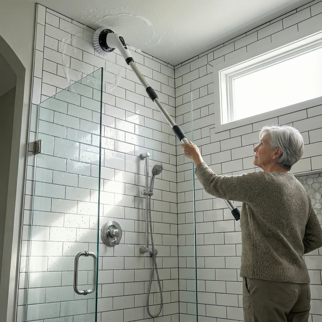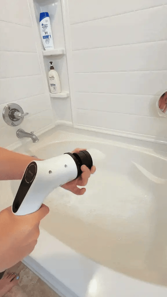 Le ScrubForce Pro utilise un moteur à couple élevé qui fait tourner les têtes de brosse jusqu’à 350 tr/min, éliminant sans effort les résidus de savon, la moisissure et la saleté incrustée — sans frotter à la main. Il suffit d’appliquer votre nettoyant, d’appuyer sur le bouton, et de laisser le moteur faire le travail.